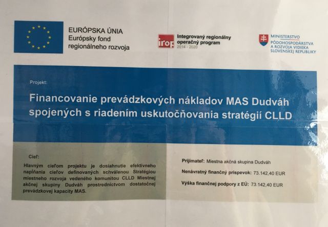 Hlavným cieľom projektu je dosiahnutie efektívneho napĺňania cieľov definovaných schválenou Stratégiou miestneho rozvoja vedeného komunitou CLLD Miestnej akčnej skupiny Dudváh prostredníctvom dostatočnej prevádzkovej kapacity MAS. Stratégia CLLD Miestnej akčnej skupiny Dudváh napomáha k riešeniu problémov poznačených v Programe rozvoja vidieka SR 2014 – 2020 a v Integrovanom regionálnom operačnom programe 2014 – 2020. Obsahuje širokú škálu podporovaných opatrení a aktivít, ktoré prinášajú inovatívny prístup k rozvoju vidieckej oblasti. Realizáciou činností MAS dôjde k skvalitneniu života miestnych obyvateľov, zabezpečeniu dostatočného počtu pracovných miest priamo v obciach a budovanie miestnej identity a komunity.